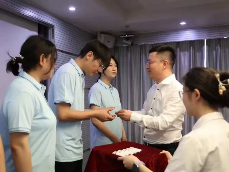 伴隨著激昂的音樂,入職儀式進(jìn)入了發(fā)放工牌的環(huán)節(jié)。國芳集團(tuán)各位領(lǐng)導(dǎo)面帶微笑,將蘊含著公司信任與期望的工牌并伴手禮交到新員工手上,工牌在燈光的照耀下,折射出他們堅定的信念和對新征程的信心。